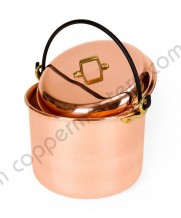 Panela de cobre tradicional lisa com arco de ferro. Esta panela tradicional é usada no Norte de Portugal e Espanha para cozer o Polvo, iguaria muito apreciada na região e muito utilizada em épocas festivas. Desde os tempos antigos que estas panelas em cobre são usadas, tradição que ainda se mantém nossos dias.