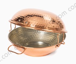 Utilizada para cozinhar receitas tipicamente Mediterrânicas, especialmente amêijoas e mariscos, de uma forma geral, o processo de cozedura utilizado na CATAPLANA impede a perda dos aromas dos alimentos, garantindo um pleno e excelente sabor. Além disso, a cozedura na CATAPLANA é mais saudável, pois permite reduzir calorias e gordura na confecção das suas receitas. A típica Cataplana em cobre (estanhada no interior), como é o caso da nossa, distribui o calor de forma mais uniforme e eficiente. Este modelo específico de cataplana com fundo plano é ideal para a nova tecnologia de fogões eléctricos de "Vitrocerâmica". A nossa versão de cataplana "Premium" é produzida utilizando cobre de uma maior espessura, com um acabamento martelado e um estanho interior de qualidade premium.