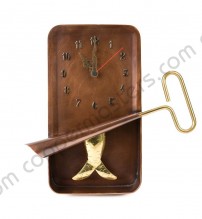 Outra magnífica obra de arte feita em cobre. Trata-se de um relógio com o formato de uma lata de sardinha. Este relógio tem a particularidade de ter a sardinha como pêndulo. Mais um exemplo da mestria patente dos nossos artífices.